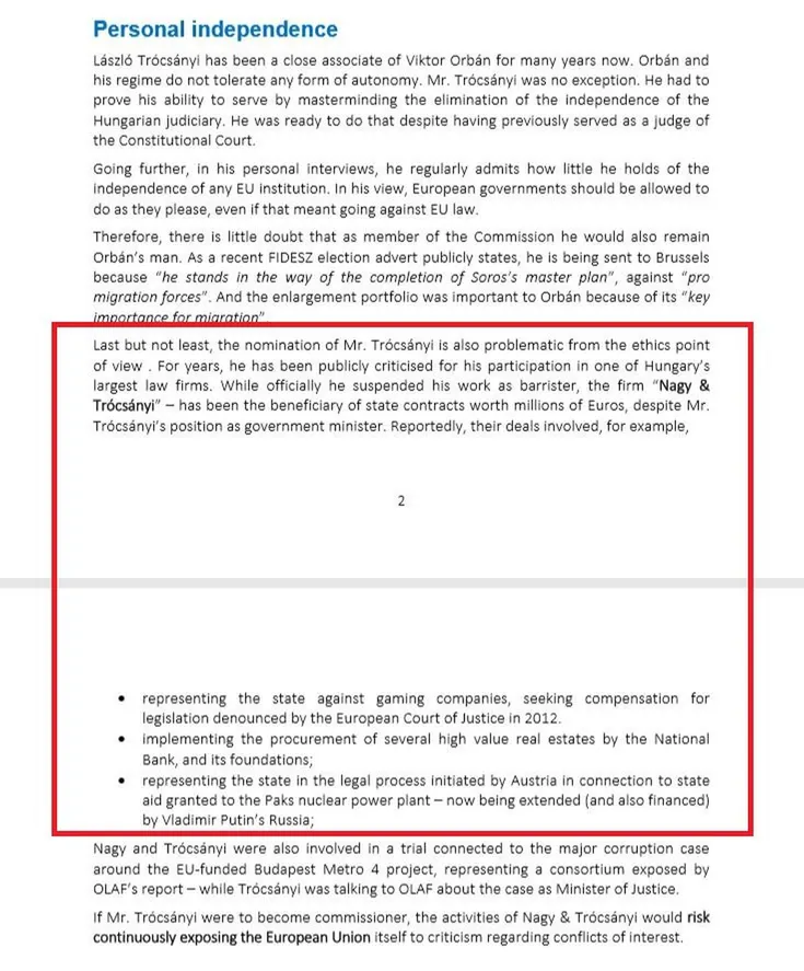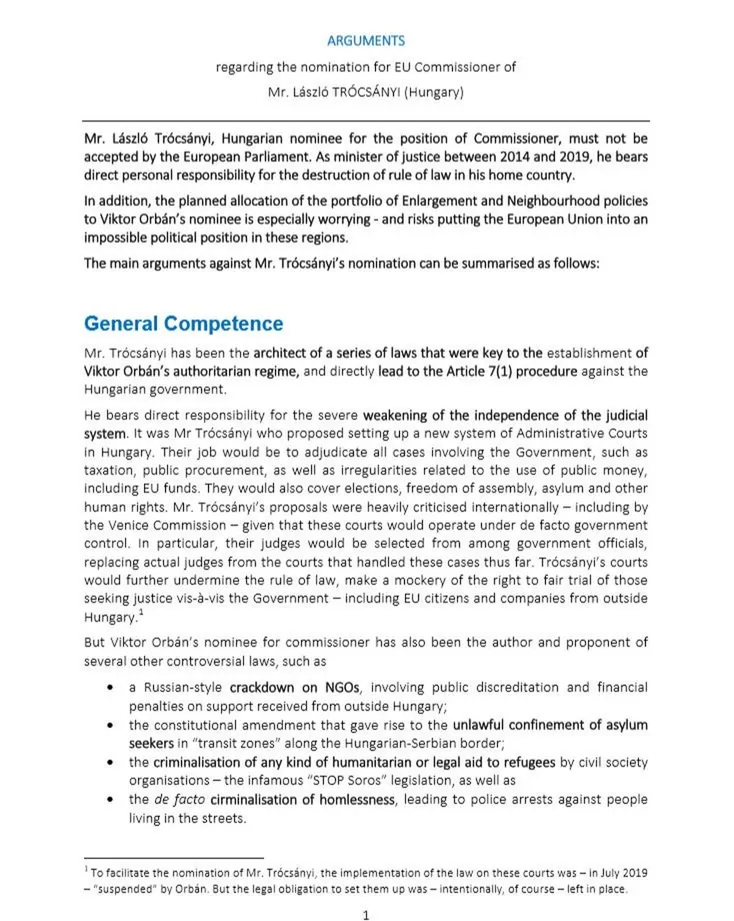 “az Európai Parlament nem fogadhatja el Trócsányi Lászlót biztosnak, mert 2014 és 2019 között miniszterként felelős a jogállamiság magyar megsértésében, bővítési és szomszédságpolitikáért felelős biztosi tisztsége pedig azzal járna, hogy a régióban lehetetlen politikai helyzetbe kerülne az Európai Unió”.