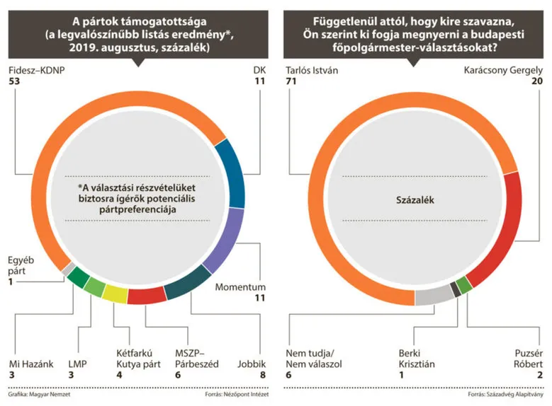Őrzi masszív többségét a Fidesz—KDNP a pártok népszerűségi versenyében, a polgári oldal a leadott szavazatok 53 százalékát szerezné meg egy aktuális választáson — derült ki a Nézőpont Intézet friss kutatásából. Közben az ellenzéki pártokkal szimpatizálók köre stagnált vagy csökkent az elmúlt hónapban. A Századvég felmérése szerint Tarlós Istvánnal, a Fidesz—KDNP budapesti főpolgármester-jelöltjével a fővárosiak 53 százaléka szimpatizál, a munkájával pedig még ennél is többen, 57 százaléknyian elégedettek.
