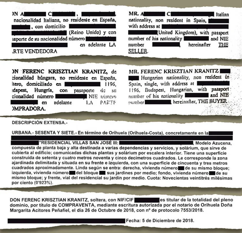 Hozzátette: nem biztos benne, hogy ezek a dokumentumok igazak. A Magyar Nemzet birtokába jutott egy előszerződés, amely alapján a spanyolországi földhivataltól kértük ki az ingatlan dokumentumait. Az előszerződés szerint A. C. nagy-britanniai lakcímmel rendelkező olasz állampolgár adta el az új építésű ingatlant Kránitz Krisztiánnak, a kispesti vagyonkezelő igazgatójának, XIX. kerületi önkormányzati képviselőnek. Az előszerződést 2018. július 13-án hitelesítették a felek aláírásukkal.