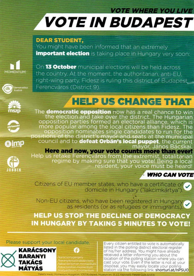 A Ferencvárosban terjesztett kampánykiadvánnyal a kerületben élő, lakcímkártyával rendelkező uniós polgárok, valamint a letelepedési engedéllyel bíró bevándorlók és menekültek figyelmét igyekeztek felhívni, hogy az október 13-i önkormányzati választáson voksaikkal a „demokrácia helyreállítása érdekében” az ellenzék jelöltjeit támogassák Bácskai Jánossal, a Fidesz „bábjával” szemben.