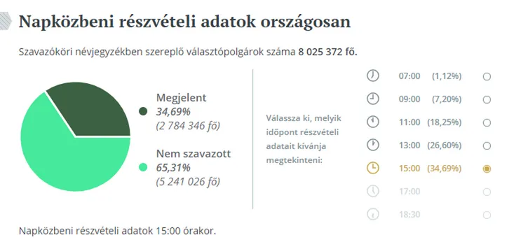A fővárosban a szavazók 36,37 százaléka, 497 525 választópolgár adta le szavazatát 15 óráig.
