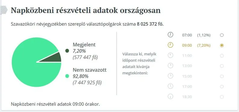 Budapesten a reggel 7 órai adatok szerint a választásra jogosult 1 millió 367 ezer választópolgárból 0,92 százalék, 12 555 választó adta le szavazatát.