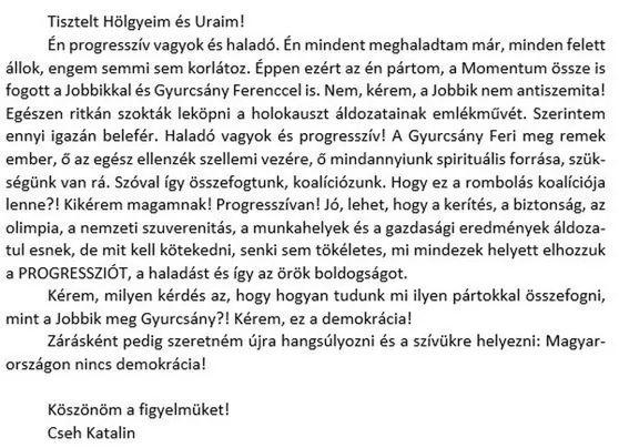 A Facebookon reagált Menczer Tamás Cseh Katalin levelére, melyből kiderül: a Momentum politikusa ismét árulkodni fog a hazája ellen, ezúttal az Egyesült Államok Kongresszusa elé viszi a magyar jogállamiság kérdéseit. A PestiSrácok beszámolója szerint a KKM tájékoztatásért és Magyarország nemzetközi megjelenéséért felelős államtitkára Cseh Katalint kifigurázó levelében kifejti: „annyira progresszív és haladó, hogy minden meghaladott már, minden felett áll, és semmi nem korlátozza”, valamint arra is kitér, hogy a Momentum összefogott Gyurcsány Ferenccel és a Jobbikkal.