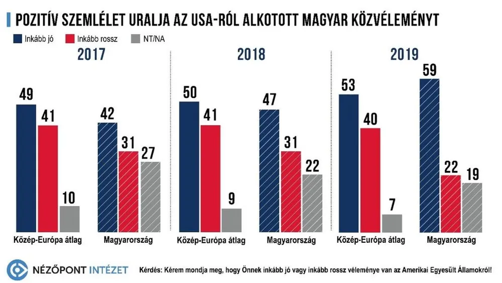 A magyar közvélemény a tíz ország közül a negyedik legkedvezőbb az Egyesült Államokat illetően, a megkérdezettek 59 százaléka van jó véleménnyel, míg csupán 22 százalék nyilatkozott negatívan az USA-ról, ami a regionális átlagon felüli adat. Az Amerikáról alkotott kedvező vélemény Donald Trump elnöksége alatt, azaz az elmúlt három évben folyamatosan erősödött, hiszen míg 2017-ben a magyarok 42 százaléka vélekedett pozitívan, addig 2018-ban már 47 százaléknyian, majd 2019-re számottevően tovább nőtt a jó véleménnyel rendelkezők aránya. A pozitív változások mögött az állhat, hogy közel másfél éves szünet után 2018 júniusában új nagykövet érkezett hazánkba David B. Cornstein személyében, majd 2019 májusában a Fehér Házban fogadta Orbán Viktor miniszterelnököt – hangsúlyozta Mráz Ágoston.