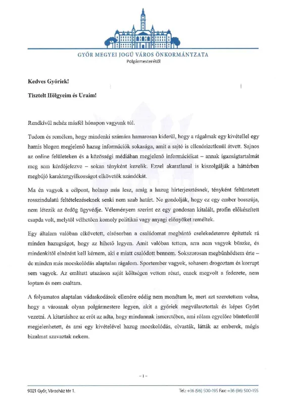 - írja a győrieknek címzett nyílt levelében, amelynek másolata lent látható.