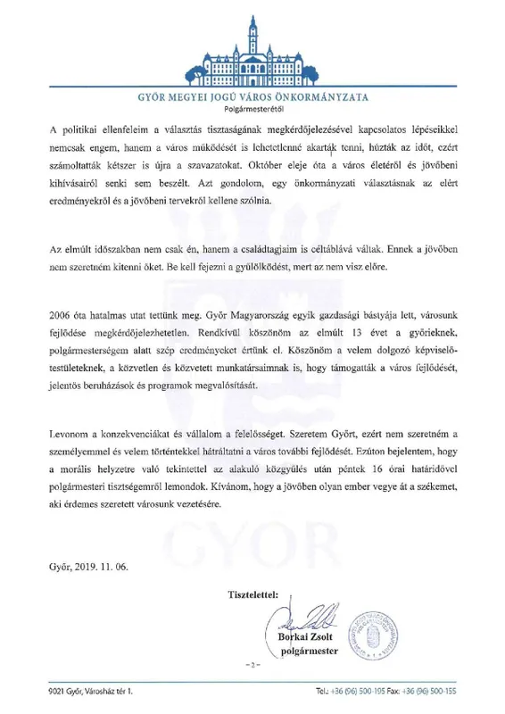 A médiában egyre nagyobb hullámokat verő botránya következtében lemond Győr polgármestere. A Fideszből kilépő politikus levelében arról ír, hogy bár szerette volna ha Győrt olyan vezeti, aki ért a városvezetéshez és akit a választópolgárok megválasztottak, a karaktergyilkos médiakampány nyomására beadja a lemondását.