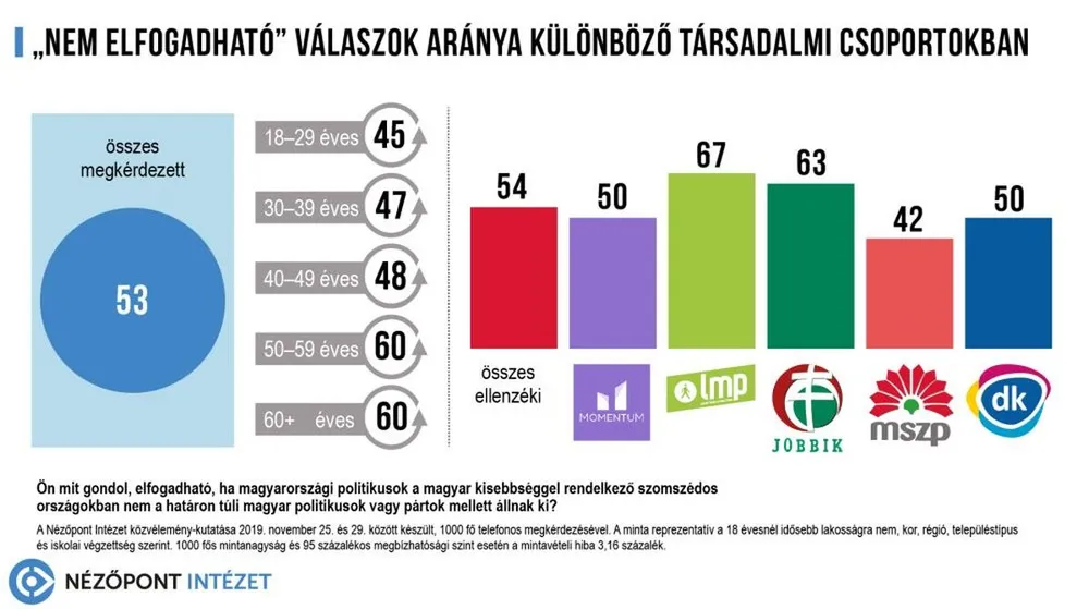 A megkérdezettek 53 százaléka tartja ezt elfogadhatatlannak, ellenkező választ csupán 34 százalék adott. Érdekes, hogy a magukat Momentum-szimpatizánsnak mondók fele szerint sem elfogadható a határon túli magyar politikusoktól megtagadott támogatás.