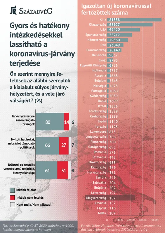 Ezzel összefüggésben a Századvég a márciusi közvélemény-kutatásában megvizsgálta, hogy a magyar lakosság szerint mely szereplők a leginkább felelősek a kialakult járványhelyzetért, illetve az ezzel járó negatív következményekért. A felmérés alapján kijelenthető, hogy a magyarok 80 százaléka felelősnek tartja a koronavírus-járvány terjedésére későn reagáló országokat, míg a 14 százalékuk ettől eltérő álláspontra helyezkedett. A megkérdezettek többsége ugyancsak felelősnek látja a nyitott határokat, illetve a migrációt támogató politikusokat (66 százalék), valamint az Európai Unió vezetésének lassú, bizonytalan reakcióját (61 százalék), ezzel szemben a 27, illetve 31 százalékuk szerint ezek nem tehetők felelőssé a kialakult helyzetért. Ez utóbbi kérdés kapcsán érdekesség, hogy a liberális nézeteket képviselő Renew Europe európai parlamenti frakcióban helyet foglaló cseh Radka Maxová (a momentumos Cseh Katalin és Donáth Anna frakciótársa) a koronavírus által okozott szorongatott helyzetben is a magyar kormány által kihirdetett veszélyhelyzet meghosszabbításának szándékát ostorozta, figyelmen kívül hagyva a magyar polgárok jogos igényét a járvány visszaszorítására.