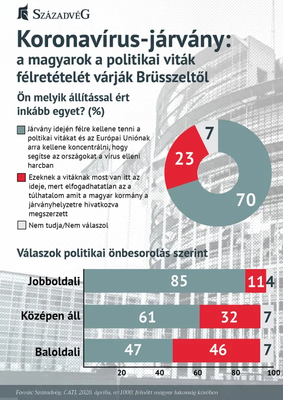 Politikai önbesorolás mentén vizsgálva a kérdést eltéréseket tapasztalhatunk. A jobboldali válaszadók 85, és a középen állók 61 százaléka támogatja a kialakult szorongatott helyzetben a politikai viták mellőzését, és csupán a 11 illetve 32 százalékuk nem tartja ezt indokoltnak. Érdekesség, hogy még a baloldali megkérdezettek körében is többen vannak azok (47 százalék), akik úgy látják, hogy a koronavírus-járvány terjedése miatt Brüsszelnek viták helyett a segítségnyújtásra kell koncentrálnia, ugyanakkor a 46 százalékuk ettől eltérő véleményt fogalmazott meg.
