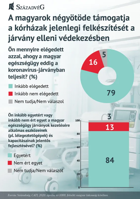 Ugyancsak megállapítható, hogy a magyarok túlnyomó többsége támogatja az egészségügyi rendszer jelenleg is zajló felkészítésének folytatását a kialakult szorongatott helyzetben: a válaszadók több mint négyötöde (84 százalék) egyetért a további eszközök (például lélegeztetőgépek) beszerzésével, illetve a kórházak kapacitásának jelentős növelésével, ezzel szemben a 13 százalékuk ezt nem látja szükségesnek.