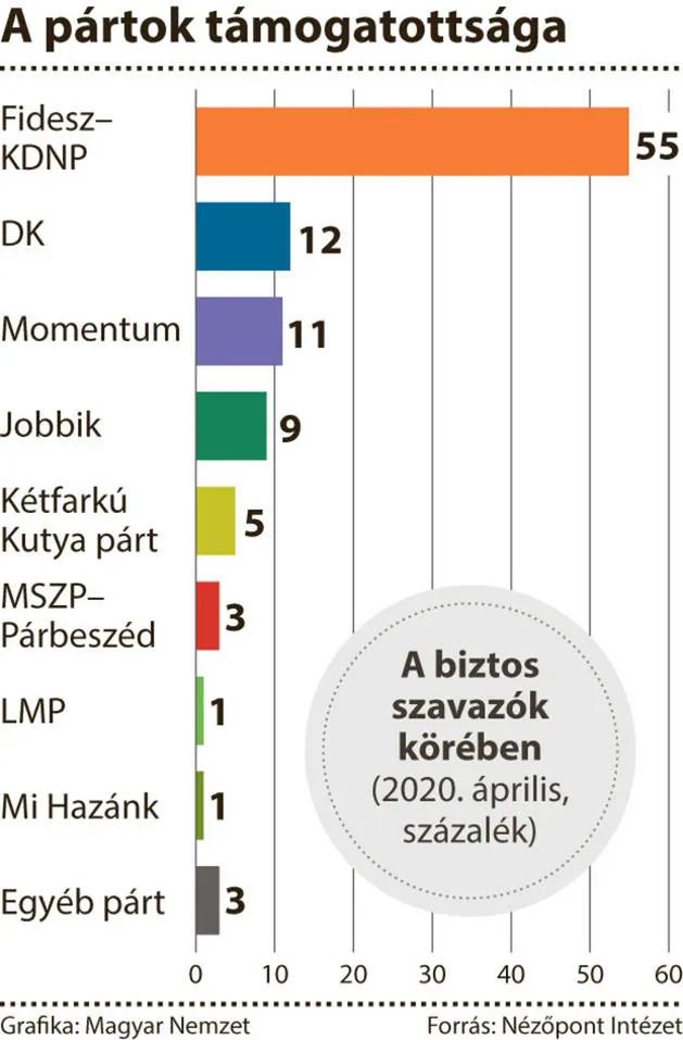 A kormánypártok is profitáltak a koronavírus-járvány elleni határozott kormányzati fellépés népszerűségéből, valamint a kormány intézkedései iránti erős bizalomból – derül ki a Nézőpont Intézet múlt heti telefonos kutatásából. Az év eleje óta öt százalékponttal, 50-ről 55 százalékra növekedett a Fidesz támogatottsága a biztosan szavazók körében. Az ellenzék esetén nincs nyertese, csak vesztese az elmúlt másfél hónapnak.