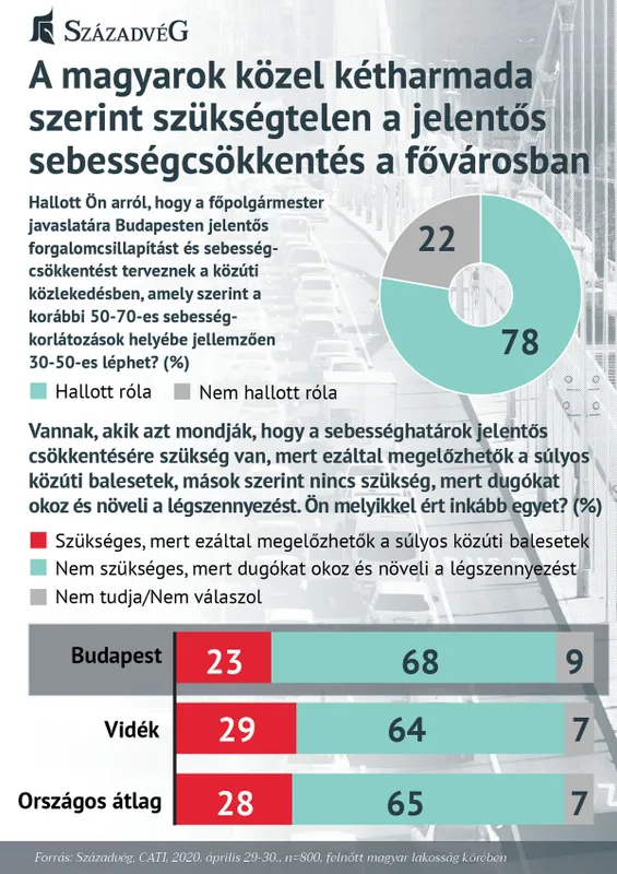 A héten a koronavírus-járvány elleni védekezés mellett Budapest forgalomcsillapításának terve határozta meg a közbeszédet, jelentős vitát kiváltva mind társadalmi, mind politikai szinten. A témával kapcsolatos közéleti vitában leghangsúlyosabban két vélemény jelent meg egymással szemben. A terveket támogatók szerint szükséges a jelentős sebességcsökkentés, mert ezáltal megelőzhetők a súlyos közúti balesetek, a kritikát megfogalmazók a növekvő forgalmi dugókat és a légszennyezést emelték ki. A Századvég közvélemény-kutatása az ügy ismertségét és támogatottságát vizsgálta a felnőtt magyar lakosság körében.