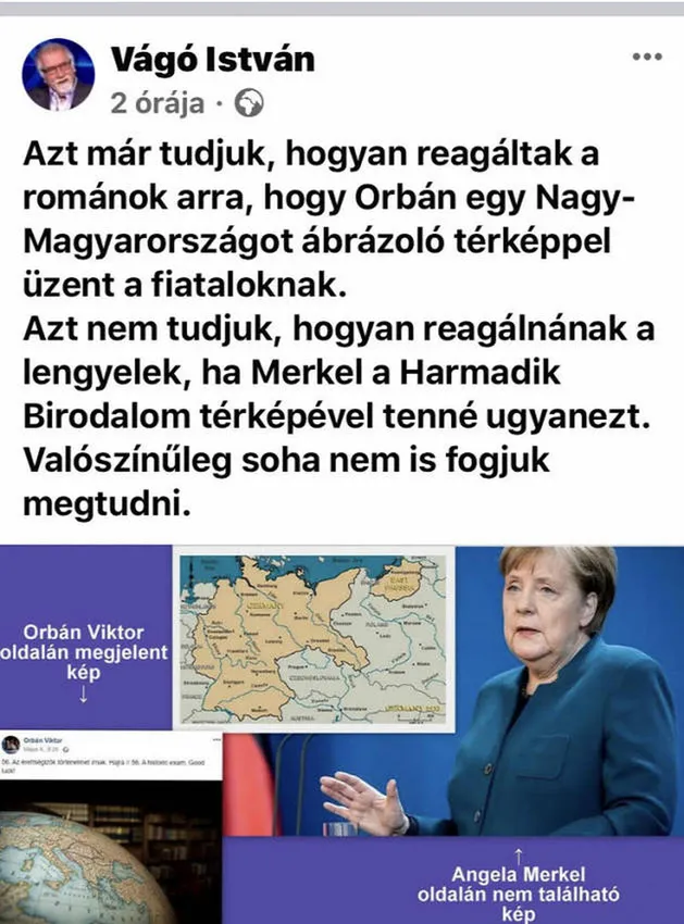 „Azt már tudjuk, hogyan reagáltak a románok arra, hogy Orbán egy Nagy-Magyarországot ábrázoló térképpel üzent a fiataloknak. Azt nem tudjuk, hogyan reagálnának a lengyelek, ha Merkel a Harmadik Birodalom térképével tenné ugyanezt. Valószínűleg soha nem is fogjuk megtudni” – írta Facebook oldalára Vágó István, Gyurcsány Ferenc közeli bizalmasa, a DK politikusa, ezzel védve a román Trianon-törvényt és megpróbálva támadni a magyar miniszterelnököt.
