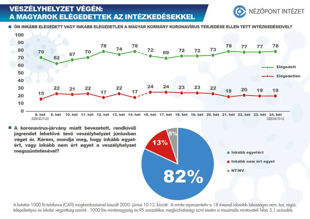 A veszélyhelyzet márciusi bevezetésével és mostani kivezetésével is egyetért a magyarok legalább négyötöde – ez derül ki a Nézőpont Intézet múlt heti kutatásából. Tízből nyolcan elégedettnek mondták magukat a járvány elleni kormányzati lépésekkel is, még a 60 év fölöttiek körében is tízből heten a kormány oldalára helyezkedtek ebben a kérdésben. A koronavírus elleni kormányzati fellépés nemcsak járványügyi, de politikai sikertörténet is a kabinetnek.