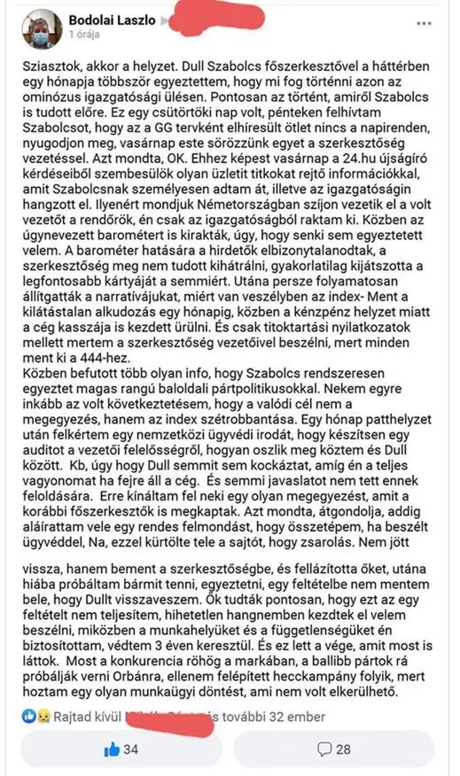 .. befutott több olyan info, hogy Szabolcs rendszeresen egyeztet magas rangú baloldali pártpolitikusokkal. Nekem egyre inkább az volt következtetésem, hogy a valódi cél nem a megegyezés, hanem az Index szétrobbantása