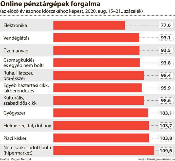 Augusztus közepén már többször csengetett a pénztárgép a nagy áruházláncokban, a kisebb élelmiszerboltokban, a piacokon, a dohányboltokban és a gyógyszertárakban is, mint tavaly – tudtuk meg az adóügyi államtitkártól. Izer Norbert az online pénztárgépek adatait ismertetve összességében úgy fogalmazott: a kereskedelemben és a vendéglátásban – az adatok szerint – az újranyitás után egyre inkább élénkül a kereslet. Úgy vélekedett: a forgalomnövekedés, a béremelkedés, a munkahelyek számának alakulása és az ütemesen érkező állami bevételek együtt azt mutatják, hogy hatékony volt a válságkezelés.