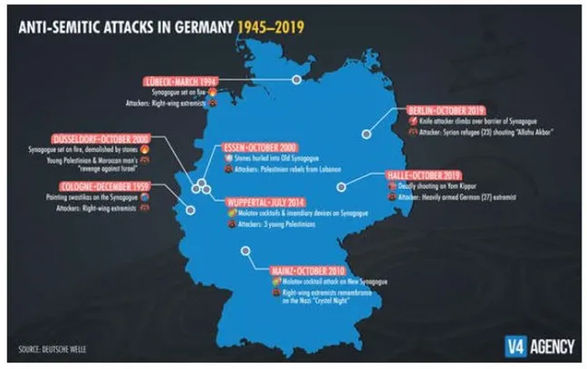 Németországban 2019-ben 1824 antiszemita jellegű bűncselekmény történt, ezek a fenyegetéstől a könnyű testi sértésen át egészen a gyilkosságig terjednek. A legutóbbi ilyen, országos felháborodást kiváltó cselekmény 2019. október 9-én, a zsidó jom-kippúr ünnepén történt a kelet-németországi Halléban. A 28 éves Stephan Balliet lőfegyverekkel és saját készítésű robbanóeszközökkel felszerelve, autójával megállt a kelet-németországi Halle zsinagógája előtt, majd megpróbált bejutni az imaházba. A zsinagógában 52 ember tartózkodott egy istentiszteleten. Miután a támadó nem tudott bejutni a zsinagógába, lelőtt egy arra járó 40 éves nőt az utcán, majd kocsijával továbbhajtott egy közeli török étkezdébe, ahol megsebesített egy 20 éves férfit.