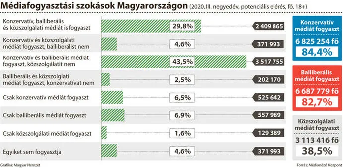 A Médianéző Központ azt is vizsgálta, hogy politikailag mennyire kiegyensúlyozott a médiapiac. A magyar felnőtt lakosság 95 százaléka, vagyis 7,7 millió fő rendszeres médiafogyasztó, a médiába vetett bizalom az uniós átlagnak megfelelő. A magyar médiapiac kiegyensúlyozott: nagyságrendileg ugyanannyian tájékozódnak konzervatív, mint balliberális forrásokból, előbbi 84 százalékot, azaz 6,8 millió, utóbbi 83 százalékot, vagyis 6,7 millió embert jelent. Azok száma, akik egyaránt tájékozódnak mindkét oldal médiumaiból majdnem hatmillió fő, azaz a választópolgárok legalább 75 százalékához garantáltan mindegyik politikai oldal nézete eljut.