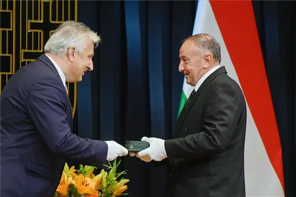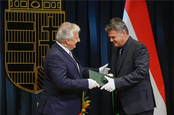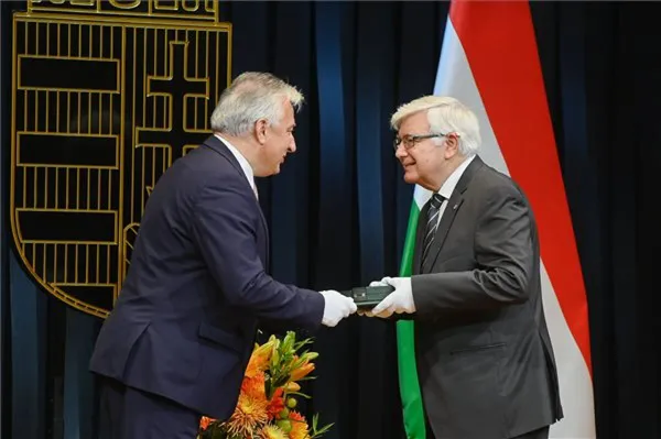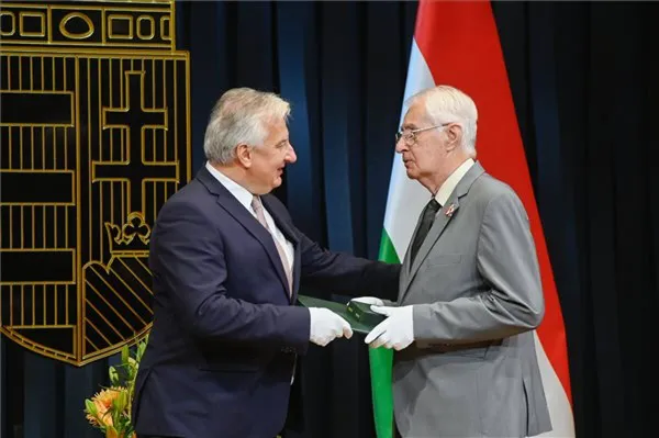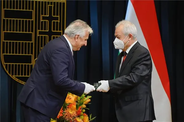 Semjén Zsolt nemzetpolitikáért felelős miniszterelnök-helyettes átadja a Magyar Érdemrend lovagkeresztje kitüntetést Gazsó L. Ferenc Táncsics Mihály-díjas újságírónak, írónak, jogásznak, a Nemzeti Közszolgálati Egyetem címzetes egyetemi docensének, a Magyar Távirati Iroda volt vezérigazgatójának az 1956-os forradalom és szabadságharc emléknapja alkalmából tartott ünnepségen a Karmelita kolostorban 2020. október 22-én: