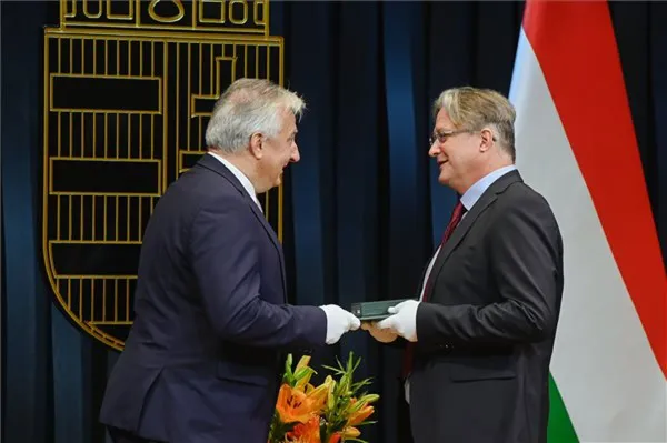 Semjén Zsolt nemzetpolitikáért felelős miniszterelnök-helyettes átadja a Magyar Érdemrend tisztikeresztje kitüntetést Antalóczy Attila Gábornak, a Széphalmi Diéta alapítójának és szervezőjének az 1956-os forradalom és szabadságharc emléknapja alkalmából tartott ünnepségen a Karmelita kolostorban 2020. október 22-én: