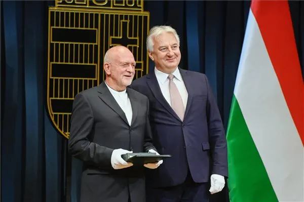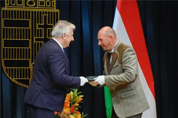 Semjén Zsolt nemzetpolitikáért felelős miniszterelnök-helyettes átadja a Magyar Arany Érdemkereszt kitüntetést Almási Sándor vadászkürtösnek, a PIPACS Vadászkürt Egyesület művészeti vezetőjének az 1956-os forradalom és szabadságharc emléknapja alkalmából tartott ünnepségen a Karmelita kolostorban 2020. október 22-én:
