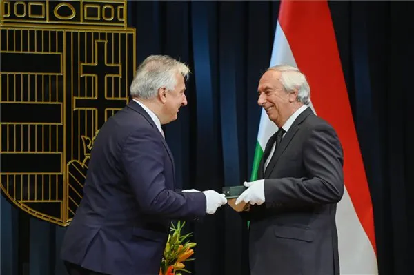 Semjén Zsolt nemzetpolitikáért felelős miniszterelnök-helyettes átadja a Magyar Érdemrend tisztikeresztje kitüntetést Csermely Péternek, a Mediaworks Hungary Zrt. tartalomfejlesztési vezérigazgató-helyettesének az 1956-os forradalom és szabadságharc emléknapja alkalmából tartott ünnepségen a Karmelita kolostorban 2020. október 22-én: