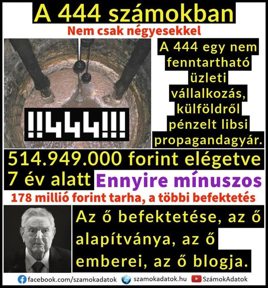 A 444 működése is fenntarthatatlan a jelenlegi formájában, emiatt a Facebook-oldal szerint lehet, hogy a 444 lesz a következő, amely az Index-Telexhez hasonlóan a kormányra mutogatva megbukik – nagyon, még jobban reméljük –, de ez sajnos valószínűtlen, mert még ez az összeg is elenyésző ahhoz képest, amit a 444 mögött állók nyerhetnek Orbán bukása esetén.