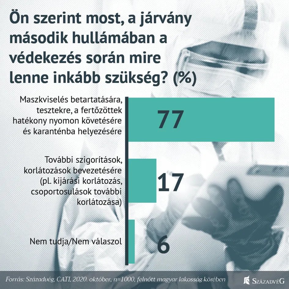 Ezzel párhuzamosan a válaszadók több mint háromnegyede (77 százaléka) úgy gondolja, hogy a maszkviselés betartatása, a tesztek, valamint a fertőzöttek megfelelő nyomon követése, majd karanténba helyezése a legfontosabb elemek a védekezés során, és mindössze a 17 százalékuk véli indokoltnak további korlátozások, illetve szigorítások bevezetését.