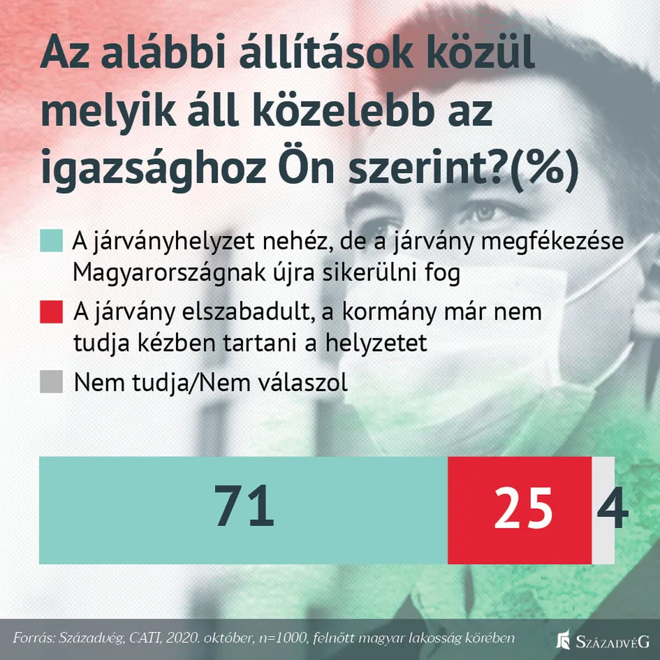 Megállapítható, hogy a magyar lakosság hazánkat az eredményesen védekező országok közé sorolja. A felmérés rámutat, hogy a megkérdezettek 60 százaléka elégedett azzal, ahogy a kormányzat a koronavírus-járvány által előidézett helyzetet az eddigiekben kezelte, ezzel szemben a 38 százalékuk elégedetlenségét fejezte ki. Ezzel párhuzamosan általános bizakodás figyelhető meg a járvány második hullámának megfékezése kapcsán. A válaszadók 71 százaléka szerint a járványhelyzet ugyan nehéz, viszont Magyarországnak újra sikerülni fog megállítani a koronavírus térhódítását, és pusztán a 25 százalékuk látja úgy, hogy a járvány elszabadult.