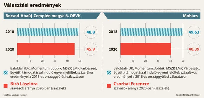 A baloldali Csorbai Ferenc esete is hasonló Mohácson, aki tavaly a leadott szavazatok 31 százalékával, de egyedüli indulóként lett polgármester, az idei időközi választáson azonban már elbukott. A 2018-as országgyűlési választásokon ugyanis az elméletben összesített baloldali egyéni jelöltek Mohácsra vetített szavazataránya 49,63 százalék volt, Csorbai pedig a 2020 szeptemberében tartott időközi választáson 40,39 százalékot ért el – fejtette ki a Nézőpont Intézet elemzésében.