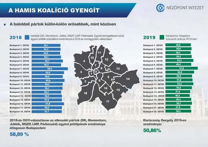 Az elemzőintézet rámutatott: nemcsak a múlt vasárnapi időközi országgyűlési választáson, de tavaly Budapesten és idén Mohácson is beigazolódott, hogy az ellenzék számára inkább hátrányos a közös indulás a szavazók lemorzsolódása miatt. Ami Budapestet illeti: Karácsony Gergely arányaiban kevesebb szavazatot ért el 2019 őszén, mint amennyit az akkor még külön-külön induló baloldali pártok jelöltjei utólagosan összesítve.