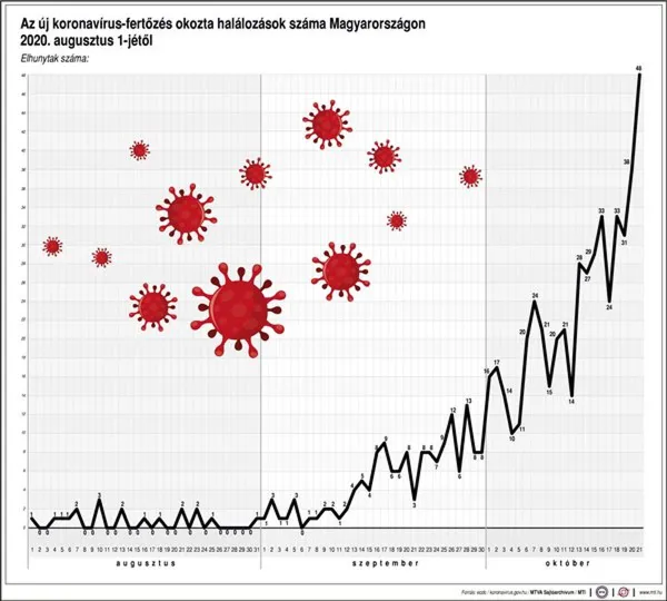 1423 újabb magyar állampolgárnál mutatták ki az új koronavírus-fertőzést (COVID-19), ezzel 50 180 főre nőtt a hazánkban beazonosított fertőzöttek száma. Elhunyt 48 többségében idős, krónikus beteg, így az elhunytak száma 1259 főre emelkedett, 14 905-en pedig már meggyógyultak. Az aktív fertőzöttek száma 34 016 fő. Az aktív fertőzöttek 30%-a, az elhunytak 39%-a, a gyógyultak 30%-a budapesti. 2023 koronavírusos beteget ápolnak kórházban, közülük 201-en vannak lélegeztetőgépen.