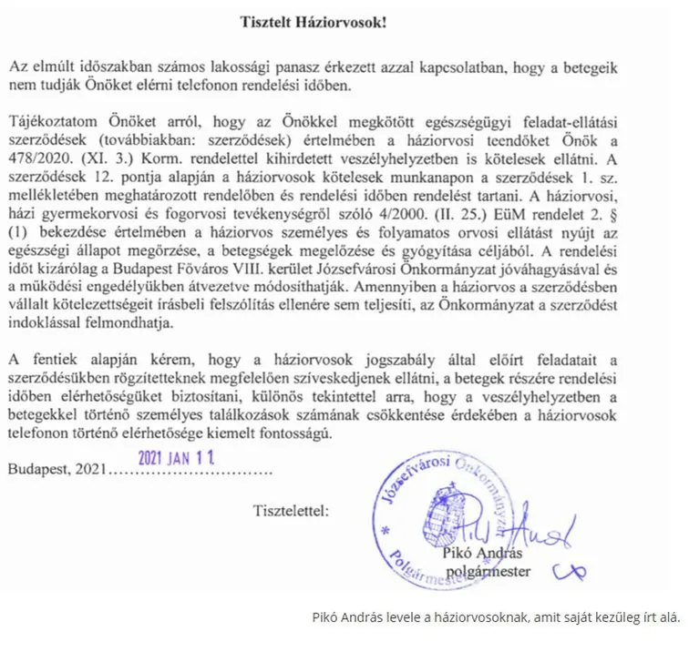 Segítséget nem, csak szerződésük felmondásával való fenyegetést kaptak a háziorvosok Pikó Andrástól. Józsefváros balliberális polgármesterének kioktató és fenyegető levelén felháborodtak a háziorvosok, akik bocsánatkérést várnak a kerület vezetőjétől.