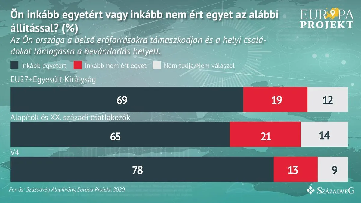 Az Európai Unió évek óta demográfiai és gazdasági nehézségekkel küzd, amely problémák lehetséges megoldási módjai állandó vitatémái az európai közbeszédnek. A kutatás alapján kijelenthető, hogy a V4-szövetség polgárainak több mint háromnegyede (78 százaléka) ért egyet azzal, hogy országának a belső erőforrásokra kellene támaszkodnia, illetve a helyi családokat kellene támogatnia a bevándorlás helyett, míg ez az arány az alapítók és a 20. században csatlakozók körében 65 százalék. Ezzel párhuzamosan a visegrádi polgárok 72, az az alapító és múlt században csatlakozó államok válaszadóinak 53 százaléka véli úgy, hogy a népességfogyás problémáját nem a bevándorlás ösztönzésével, hanem a születendő gyermekek számának növelésével kell megoldani. Látható tehát, hogy Magyarország, Lengyelország, Szlovákia és Csehország polgárai a jelentkező demográfiai és az ezzel összefüggő gazdasági kihívásokat a családok illetve a gyermekvállalás támogatásával, és nem a tömeges bevándorlás elősegítésével kívánják kezelni.