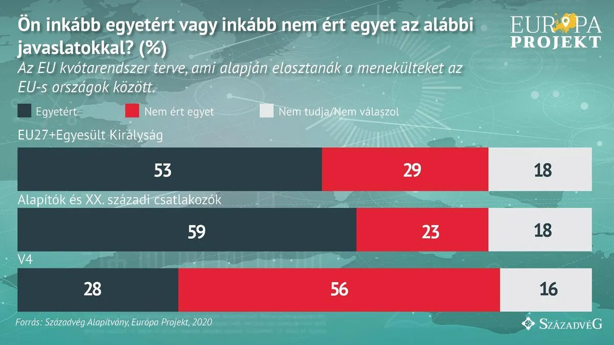 Éles törésvonal figyelhető meg azonban a nyugat-európai és közép-európai tagállamok között a migránsok szétosztását célzó brüsszeli kvótarendszer megítélésében. A kvótarendszert támogatók aránya az alapító és a 20. században csatlakozó országok körében a legmagasabb (59) százalék, míg a V4-ek tekintetében a legalacsonyabb (28 százalék) a vizsgált országcsoportok közül. A migránsok tagállamok közötti uniós elosztásának tervét ellenzők aránya az alapító és a múlt században csatlakozó tagállamok polgárai körében 23, a visegrádiak vonatkozásában 56 százalék. Ezzel összefüggő kérdés, hogy Európa hagyományos, keresztény arculatának megőrzése kiemelt prioritás a V4-együttműködés államainak körében. A felmérés szerint az alapító és a 20. században csatlakozó országok válaszadóinak 53, a visegrádi polgároknak viszont 59 százaléka véli úgy, hogy Európának meg kell őriznie keresztény kultúráját és hagyományait. A keresztény hagyományokon való túllépést, és egy világibb kultúra felé történő elmozdulást az alapító és múlt században csatlakozó tagállamok megkérdezettjeinek 37, a V4-es polgárok 32 százaléka támogatná.