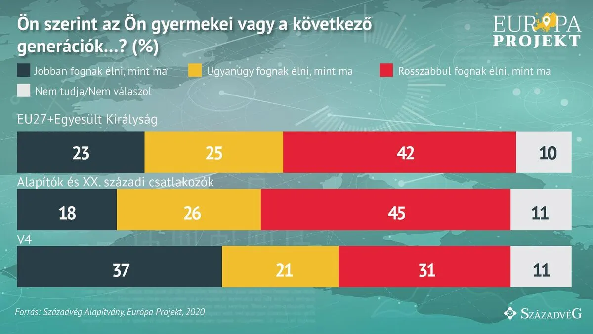 A V4-es országok közül a magyarok (42 százalék) és a lengyelek (40 százalék) a legbizakodóbbak a következő generációk jóléte kapcsán. Ebben a kérdésben is megfigyelhető, hogy az európaiak véleménye évről évre közelebb kerül a visegrádiak nézeteihez. 2019-ben az uniós és brit megkérdezettek 49 százaléka látta úgy, hogy a gyermekeik rosszabbul fognak élni, mint ma, viszont 2020-ban ez az arány 42 százalékra mérséklődött.