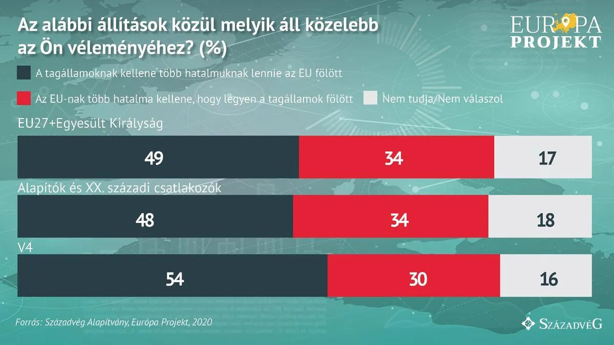 Az Európai Unió jövőjével kapcsolatos meghatározó kérdés, hogy az európai együttműködés az elkövetkezendő években a további brüsszeli hatalomkoncentráció vagy a tagállami szuverenitás védelmének irányába mozduljon-e el. A felmérés alapján megállapítható, hogy a V4-es országok az európai átlaghoz képest elkötelezettebb hívei a nemzeti szuverenitás tiszteletben tartásának Brüsszel hatalmának növelésével szemben.