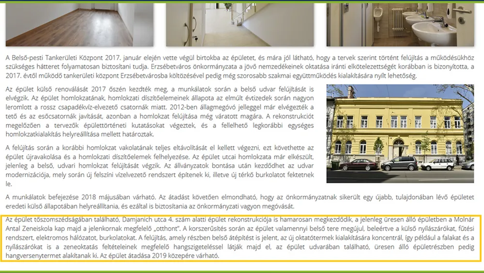 Tovább keresgélve rábukkantunk, hogy szintén született egy 175/2019. 03.11. számú Pénzügyi és Kerületfejlesztési Bizottság általi határozat is 2019 márciusában a zeneiskola felújításáról, amelyben ez áll: „Budapest Főváros VII. kerület Erzsébetváros Önkormányzata Képviselő-testületének Pénzügyi és Kerületfejlesztési Bizottsága úgy dönt, hogy Budapest Főváros VII. kerület Erzsébetváros Önkormányzata a Damjanich u. 4. szám alatti épület egy részének zeneiskola részére történő átalakítása tárgyú beruházás lebonyolítására vonatkozóan szerződést köt az Erzsébetváros Fejlesztési és Beruházási Korlátolt Felelősségű Társasággal mindösszesen 321.219.685 Ft + Áfa (bruttó 407.949.000 Ft) keretösszeg erejéig a 6901 Erzsébet Terv fejlesztési program cím terhére.”