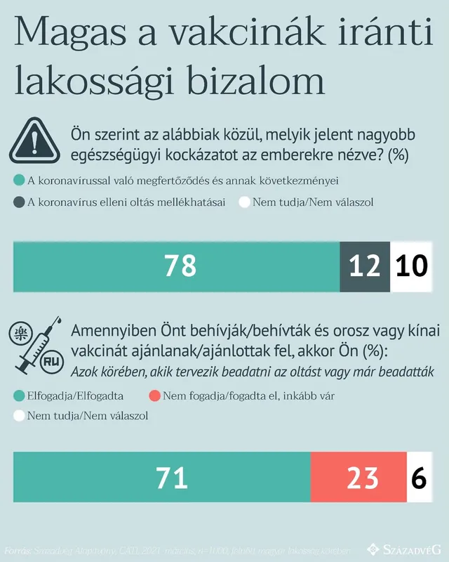 A Századvég felmérése rámutat, hogy a magyarok – az orvostudomány álláspontjával összhangban – a vakcinában látják a koronavírus megállításának garanciáját. A megkérdezettek 80 százaléka gondolja úgy, hogy a járvány kizárólag akkor fékezhető meg, ha az emberek a szükséges arányban megkapják a védőoltást, ezzel szemben a 18 százalékuk nem ért egyet ezzel az állítással. E képbe illeszkedik, hogy a válaszadók több mint háromnegyede (78 százaléka) nagyobb egészségügyi kockázatot lát a koronavírussal való megfertőződésben és ennek következményeiben, mint a vakcinák esetleges mellékhatásaiban.