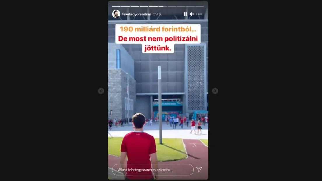 A helyszínen szurkolt Fekete-Győr András is, aki nem mulasztotta el az alkalmat, hogy tegyen egy megjegyzést az Instagram-oldalán a Puskás Aréna építési költségeiről: