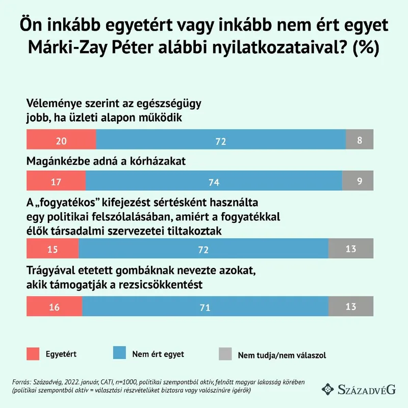 Fontos hangsúlyozni, hogy a megkérdezettek 70 százaléka úgy véli, hogy Márki-Zay nem tudja legyőzni a regnáló kormányfőt, ugyanakkor 25 százalékuk a baloldali jelölt győzelmére számít a soron következő országgyűlési választásokon. Látható tehát, hogy a hódmezővásárhelyi politikus előválasztási győzelmét követő baloldali optimizmus alábbhagyott, melynek hátterében feltehetően az áll, hogy Márki-Zay Péter több kijelentése sem egyeztethető össze a magyar választók értékrendjével. Ez utóbbi állítást bizonyítja, hogy a válaszadók 72 százaléka nem ért egyet a baloldali erők miniszterelnök-jelöltjének azon állításával, hogy jobb, ha üzleti alapon működik az egészségügy, valamint 74 százalékuk ellenzi a politikus felvetését a kórházak és rendelőintézetek magánosításáról. Ezen felül a megkérdezettek 72 százaléka kifogásolja, hogy Márki-Zay a „fogyatékos” kifejezést negatív értelemben használta egy politikai nyilatkozatában, míg 71 százalékuk nem ért egyet azzal, hogy a hódmezővásárhelyi városvezető „trágyával etetett gombáknak” nevezte a rezsicsökkentési program támogatóit.