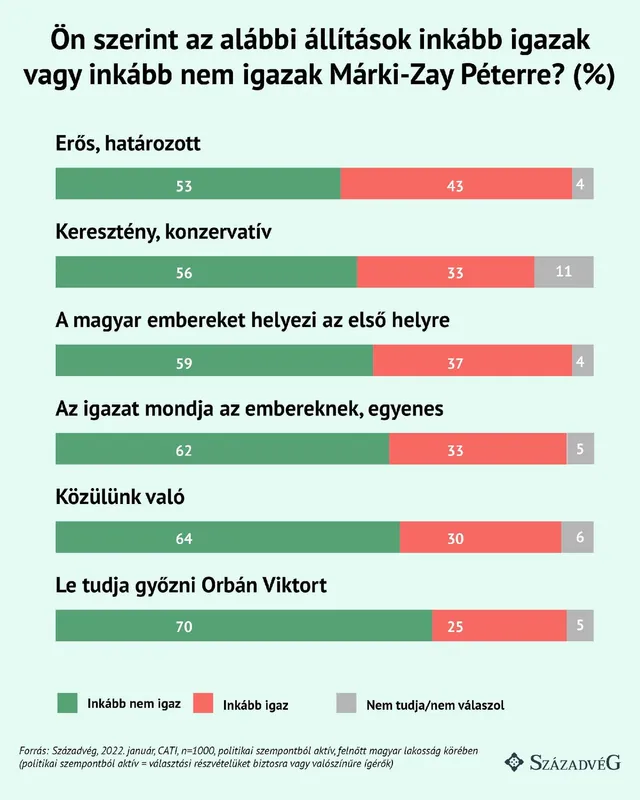 A kutatás alapján leszögezhető, hogy a magyarok többsége negatívan vélekedik Márki-Zay Péter politikai jelentőséggel bíró személyes kvalitásairól. A megkérdezettek 53 százaléka úgy látja, a balliberális miniszterelnök-jelöltről nem mondható el, hogy erős és határozott lenne, míg 56 százalékuk a politikus keresztény, konzervatív elkötelezettségét kérdőjelezi meg. A válaszadók 59 százaléka szerint Márki-Zay nem a magyar embereket helyezi az első helyre, ezzel szemben 37 százalékuk ellenkező véleményt fogalmazott meg. A hódmezővásárhelyi polgármester iránti lakossági bizalmatlanságot mutatja, hogy a magyarok 62 százaléka nem tartja őt egyenes, őszinte politikusnak, továbbá mindössze 30 százalékuk gondolja úgy, hogy Márki-Zay Péter „egy közülünk”, aki a hétköznapi emberek érdekeit képviseli.