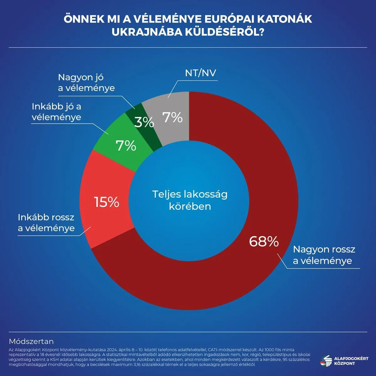 A választókorú magyarok túlnyomó többsége, 83 százaléka elutasítja azt, hogy európai katonákat küldjenek egyes nyugati és magyarországi ellenzéki politikusok Ukrajnába – derül ki az Alapjogokért Központ aktuális közvélemény-kutatásából.