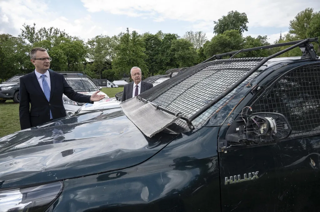 Az államtitkár és a belbiztonsági főtanácsadó a városligeti Napozóréten, a határvadászok standjánál mutatta be az autók sérüléseit: