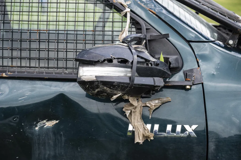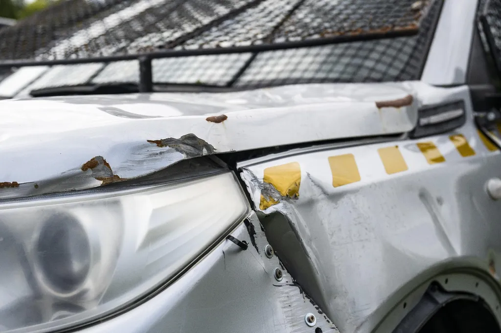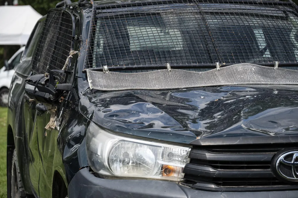 a kiállított öt járművön rácsokkal védik az ablakokat, horpadások vannak a motorháztetőkön, az ajtókon, egyes autókról a visszapillantó tükör is le van törve.