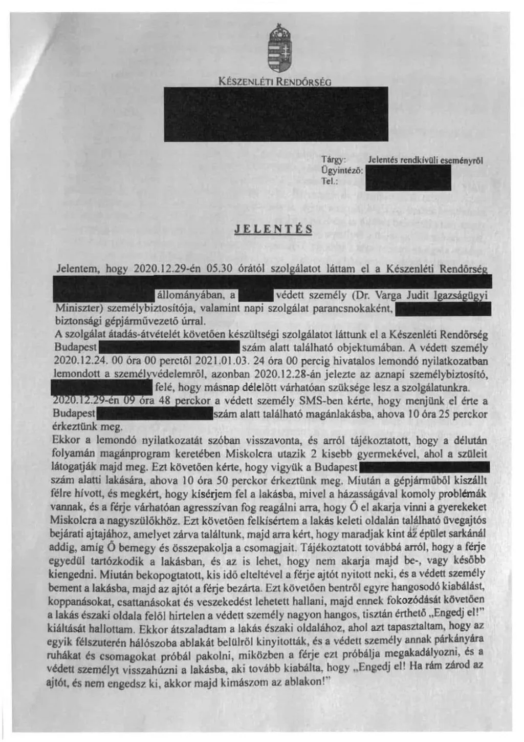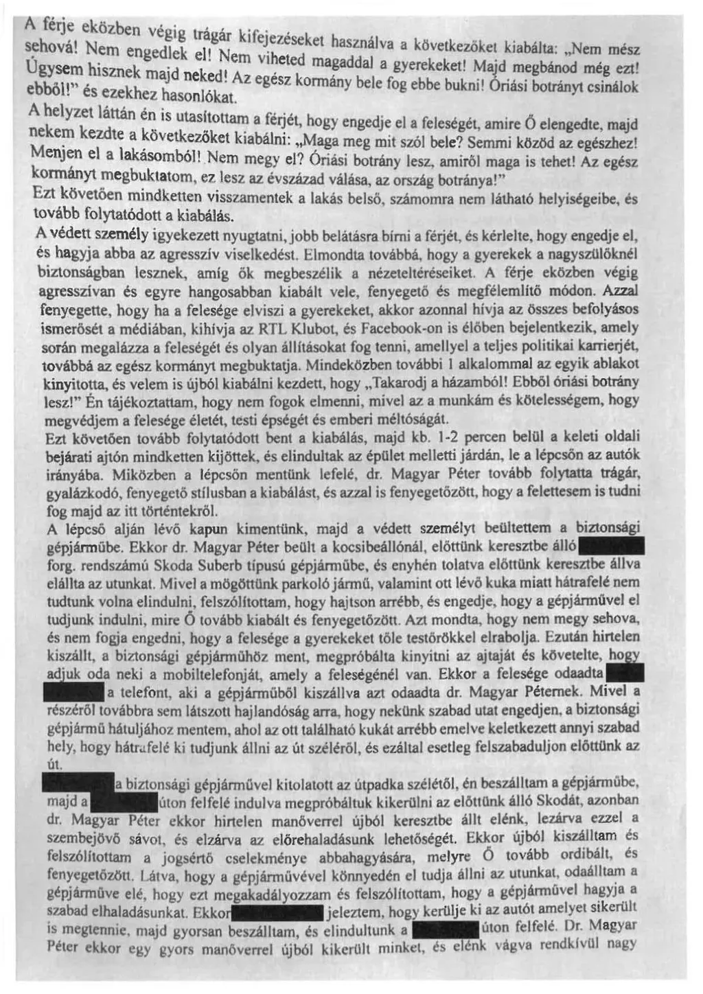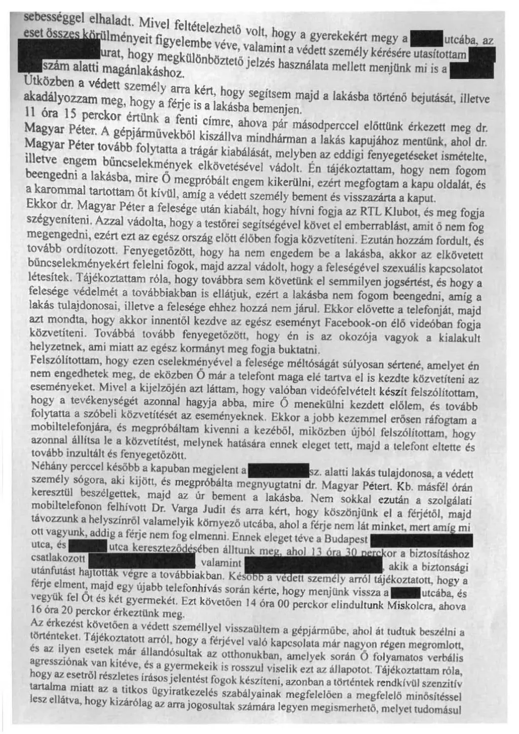 A teljes jegyzőkönyv ismeretében érthető Magyar Péter pánikreakciója, amikor megpróbálta letiltani a cikket. Azt például, hogy trágár kifejezésekkel illette gyermekei édesanyját, a rendőri felszólításoknak nem engedelmeskedett, a hatóság munkáját akadályozta, Varga Juditot pedig személyi szabadságában próbálta korlátozni. Annak ellenére, hogy a felesége többször határozottan követelte: „Engedj el!”