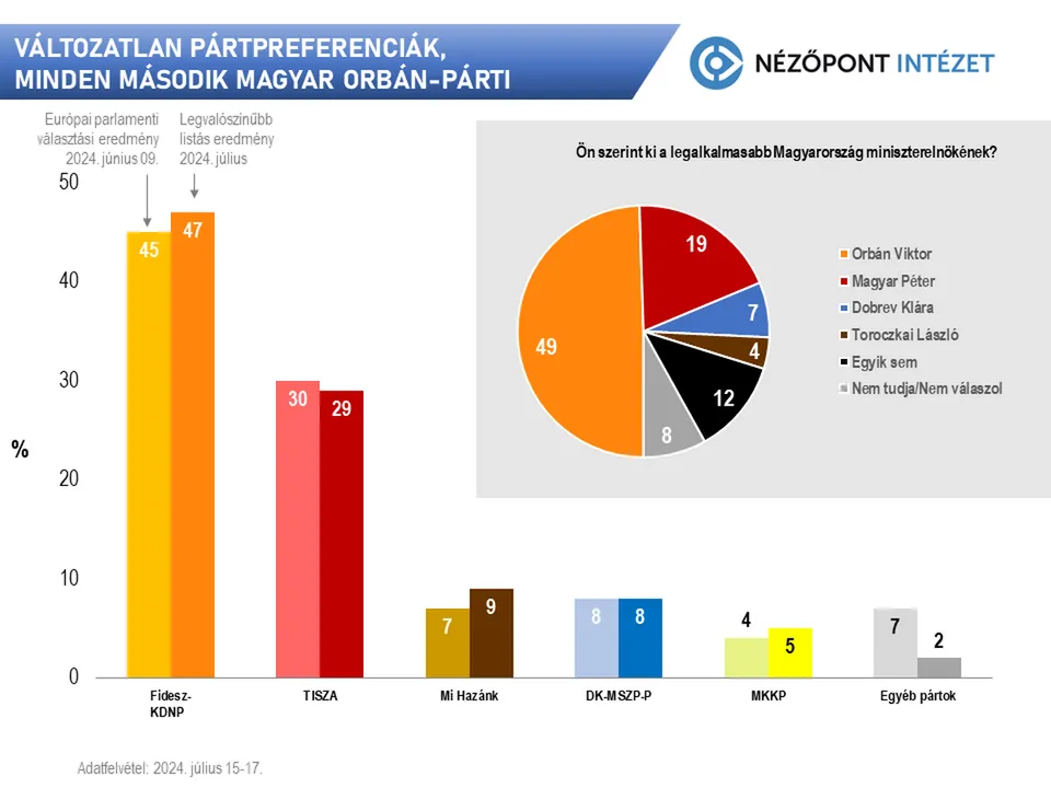 Változatlanul a Fidesz-KDNP vezeti a pártversenyt júliusban is: egy országgyűlési választáson a szavazatok 47 százalékát szerezné meg, ami ugyan 2 százalékponttal magasabb, mint júniusi európai parlamenti választási eredménye, de valójában hibahatáron belüli elmozdulás. Mindeközben úgy tűnik, hogy révbe ért a baloldali térfél tavaszi átrendeződése. A Tisza Párt 29 százalékos támogatottsággal rendelkezik (júniusban közel 30 százalékot ért el), a DK-MSZP-P koalíciója pedig megismételné az EP-választáson elért 8 százalékos eredményét.