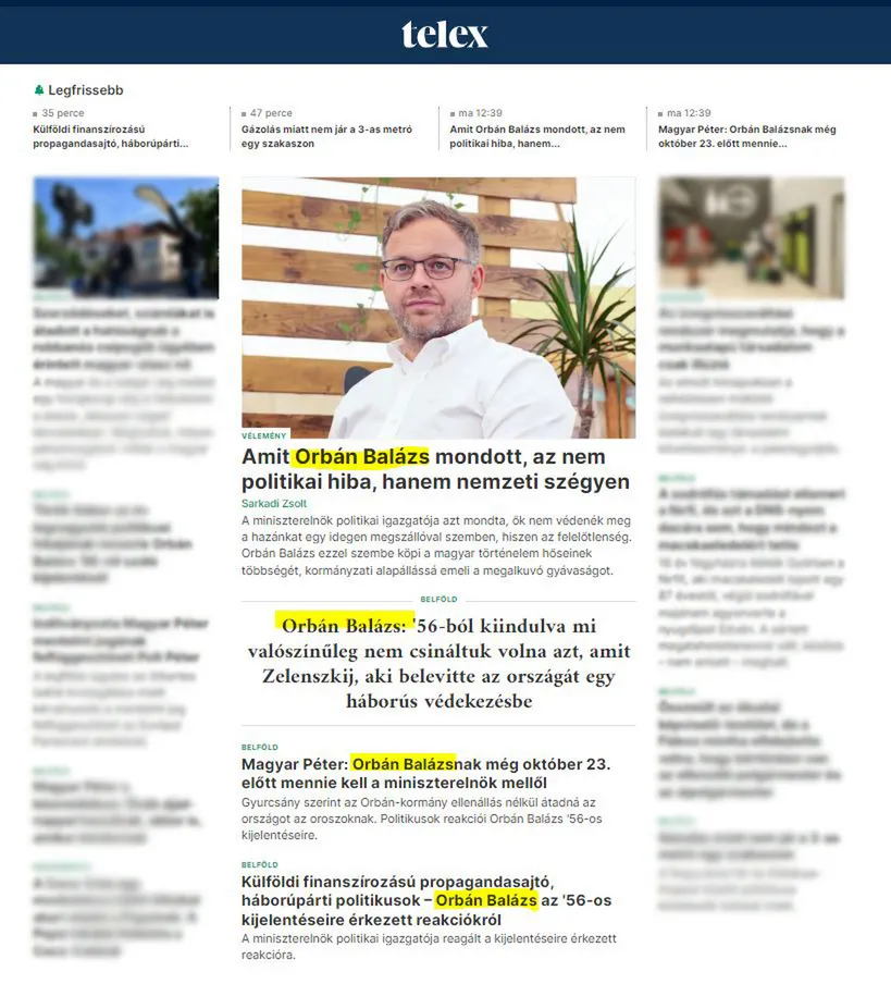 Arról, hogy mindez, hogyan a zajlik a valóságban, összeollóztunk olvasóinknak néhány képernyőképet. Amelyből jól látható: néhány perc különséggel egy féltucat cikket írt a baloldali sajtó, mintegy kiforgatva Orbán Balázs szavait (fenti kép). Ezek felkutatásához ráadásul nem kellett sokat keresgélnünk, a Telex.hu-nak például cikkünk írásakor a top 4 híre Orbán Balázs körül forog (lenti kép).