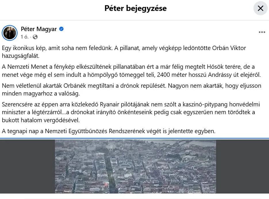 Magyar Péter "ikonikus képnek" nevezte a tüntetéséről készült fotót, amit állítólag egy Ryanair pilóta készített. (A Kossuth tér, ahol a Békemet zajlott kétszer akkora nem számolva a zsúfolásig telt környékbeli utcákat, de ne vesszünk el a részletekben.) Apró szépséghiba: a "Szigorított pilótafülke" szabály szerint ez életveszélyes szabályszegésnek minősülhet, ami akár börtönnel is büntethető. A Tisza Párt elnöke ismét leleplezte magát: vagy hazudik, vagy újabb bűncselekményre büszke?