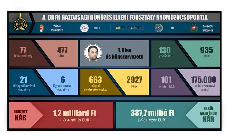 A csalássorozat ügyében számos feljelentés és eljárás indult a fővárosban és vidéken is, majd a bűncselekmény módszereiben mutatkozó hasonlóság és összefüggések alapján 2019 januárban a BRFK nyomozócsoportot hozott létre a csalássorozat felderítésére. A nyomozók az elkövetők digitális lábnyoma alapján mozaikként tették össze az egészen Dominikáig nyúló ügy részleteit, és sorra azonosították a szervezet tagjait. Bár a tagok ügyleteikhez és kommunikációjukhoz titkosított VPN kapcsolatot és különböző csevegőalkalmazásokat használtak, a Budapesti Rendőr-főkapitányság Gazdasági Bűnözés Elleni Főosztálya két év leforgása 130 embert hallgatott ki gyanúsítottként és 487 olyan bűncselekményt tárt fel, melyek elkövetésének megszervezésével T. Alex gyanúsítható.